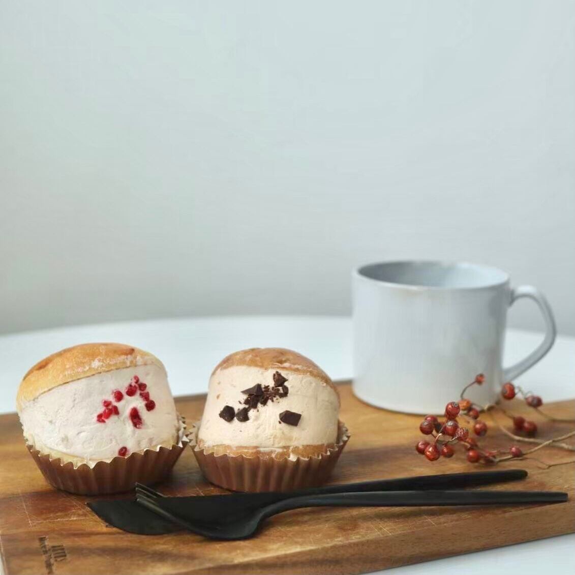 冷凍庫から取り出したら、オーブントースターで30秒〜1分(生クリームが溶けないようにパンの表面を軽く焼く程度)焼いてから解凍すると、パンがふっくらします。